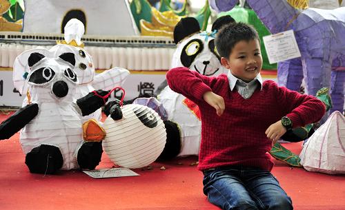2月2日,一名小男孩在圆仔花灯前拍照。新华社发(吴景腾 摄)