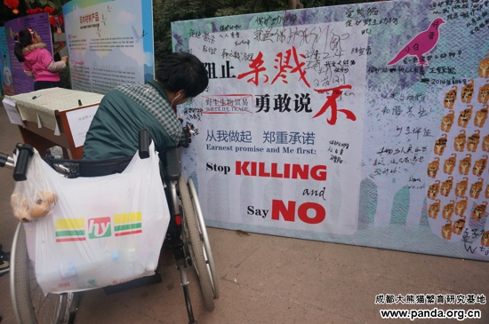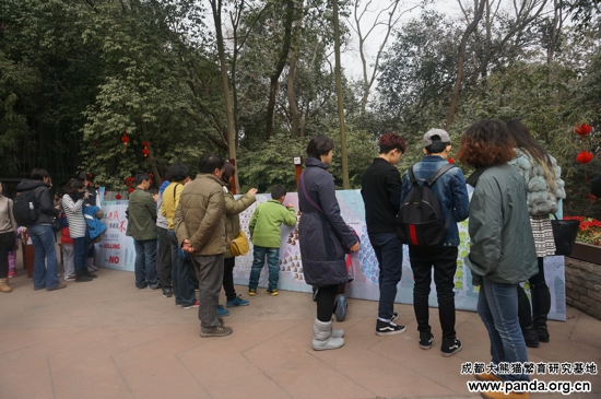 由成都大熊猫繁育研究基地主办的“拒绝野生生物贸易”展于春节期间在基地老博物馆外顺利举行。展板通过生动的小故事、严格的法律保护等级知识普及以及互动的参与模式让公众了解野生生物的生存状况、野生动物贸易以及他们自身行为可能带来的负面影响。