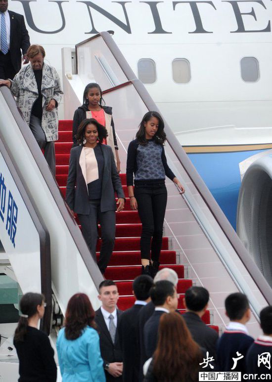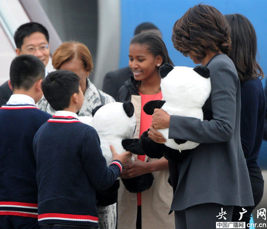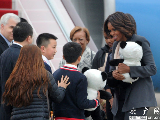 2014年03月24日,四川省成都市。下午18:50,米歇尔一行抵达成都双流国际机场,开始对成都市的友好访问。米歇尔和女儿对成都小朋友送给她们的大熊猫玩偶爱不释手。