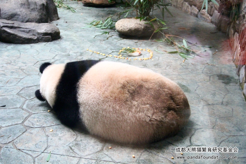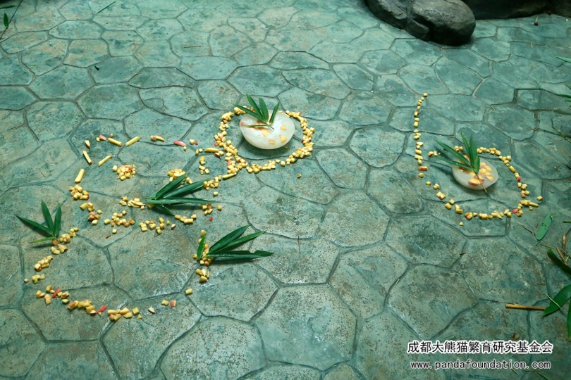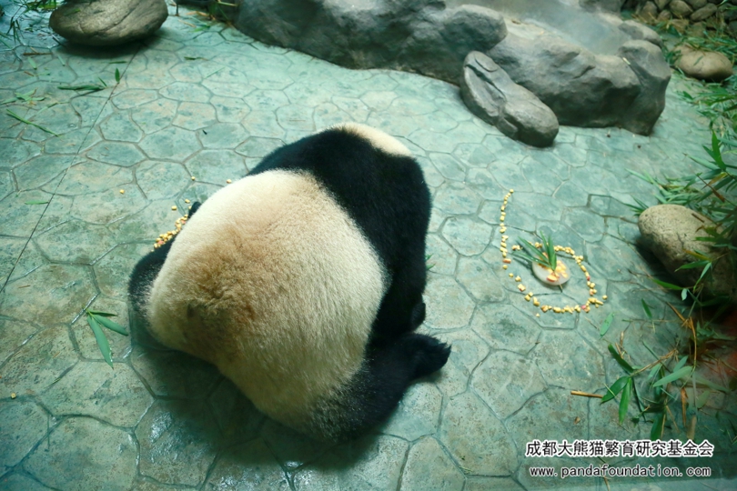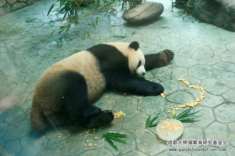 饲养员用了很多苹果块摆了一个小熊的图案、一个爱心和一个数字6,这充足的苹果让寿星都吃累了,索性躺下吃吧~