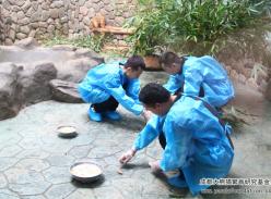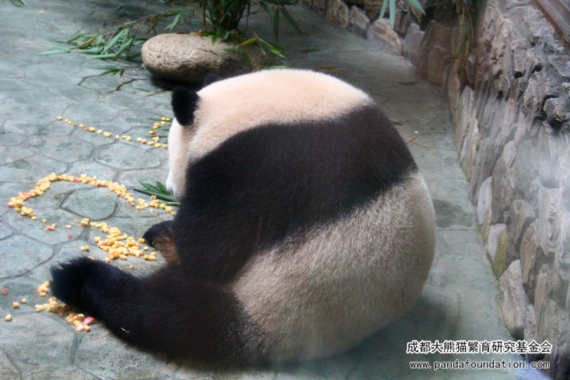 在大家的期待下,寿星终于出来了。和去年一样,奥莉奥最钟爱的还是竹子。进了室内活动场就去吃竹子的奥莉奥,丝毫没有看到它的生日蛋糕。不过没多久,它还是被苹果的味道吸引了,发现了自己的生日蛋糕。