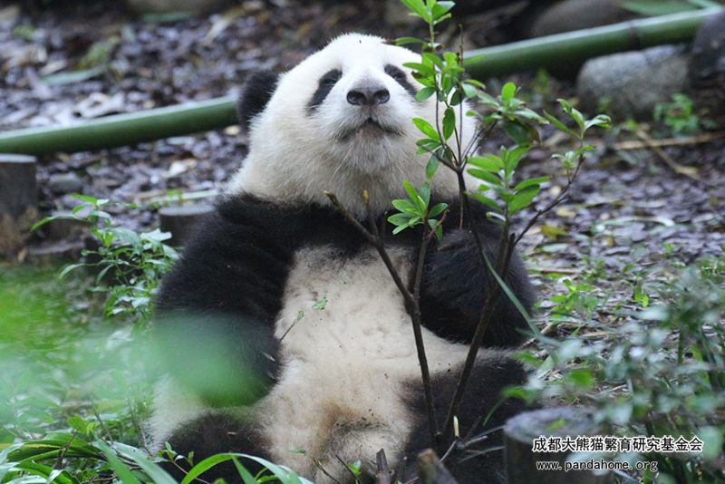 和花是一只辨识度很高的大熊猫,浓浓的黑眼圈上宽下窄,宛如用毛笔写下的两个上下颠倒又左右对称的顿号。