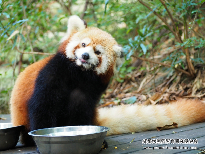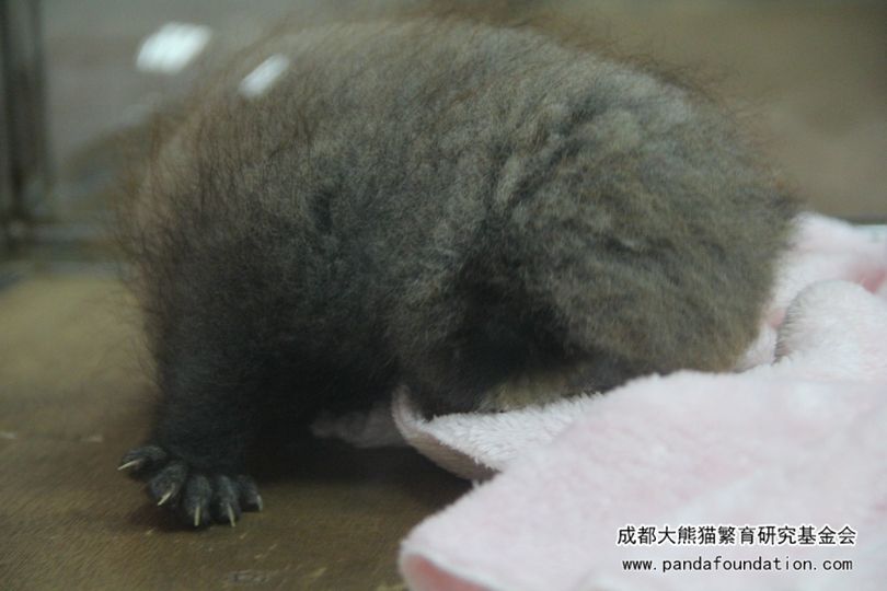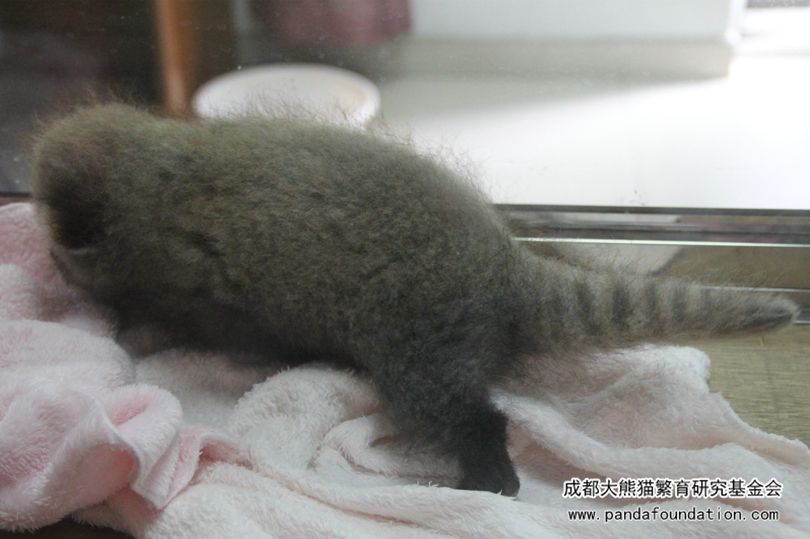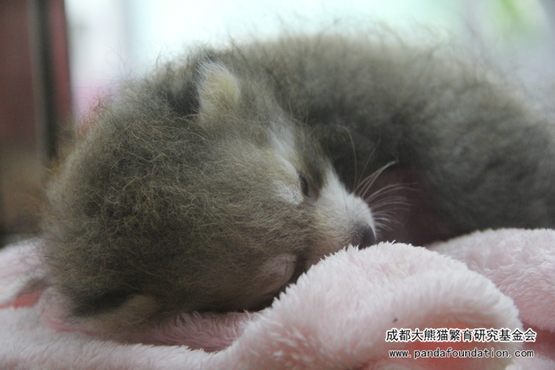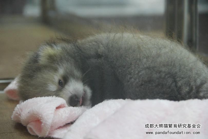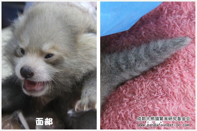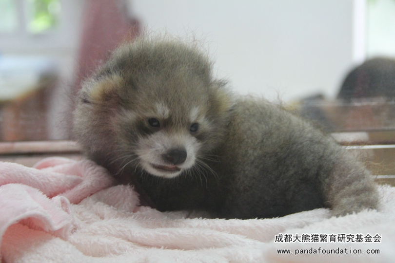 Este cachorro tiene una edad de dos meses, al acurrucarse, se parece a un kiwi amplificado. Su cuerpo es gris y un poco moreno y su pelo es denso pero poco largo. Las rayas que tiene en la cara, en cierta medida, le hacen parecido a un panda rojo. Sus icónicas orejas grandes no se han formado. Su cola, corta y fina, gira de vez en cuando como si estuviera aprendiendo a utilizarla para mantener el equilibrio. Debido a la cola, los pandas rojos también son nombrados los lobos de nueve anillos. Los nueve anillos se refieren a las rayas en sus colas peludas. Pero no aparecen hasta los 15 o 20 días tras nacer.