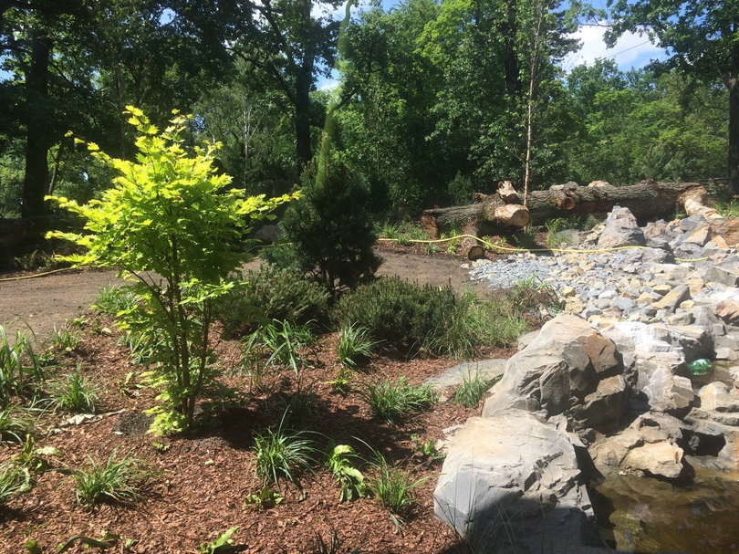 Además del color simbólico de China, en el campo de diversión hay un arroyo, un bosquecillo de bambú y unas plataformas.