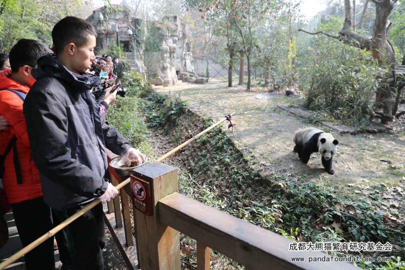 Al ver al cuidador sosteniendo una caña de bambú, el panda no puede esperar para venir.
