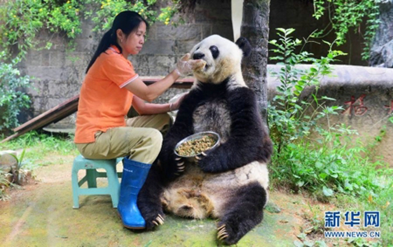 La señora Shi está alimentando cuidadosamente a Basi.