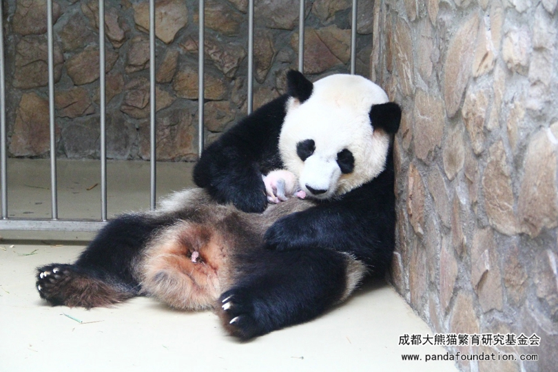 El día 15 de julio de 2017, la panda gigante Qi Zhen parió una cachorra en el Paritorio de la Luna de la Base para la Investigación de Cría del Panda Gigante, al cual se le denominó Zhen Xi. Al nacer, Zhen Xi tenía 168 gramos. Era una pandita muy saludable, mucho más pesada que Wu Yi (su hermano mayor, que pesaba solo 51 gramos al nacer).