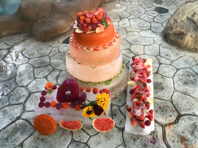 Dentro del pabellón se colocaron pasteles de hielo súper lujosos que el personal había preparado con todo esmero. Uno era hermoso y encantador y el otro, espectacular y llamativo. ¡Qué grandioso era este espectáculo con diversas frutas y verduras apiladas encima de los pasteles!