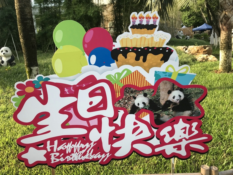 Fuera del pabellón del panda gigante en el zoológico, se hizo con anticipación un cartel para la fiesta de cumpleaños de Ji Mei y Ji Lan por parte del zoológico.