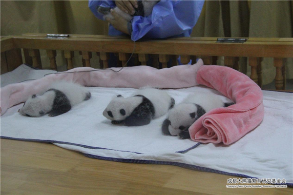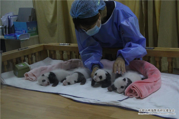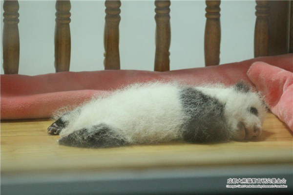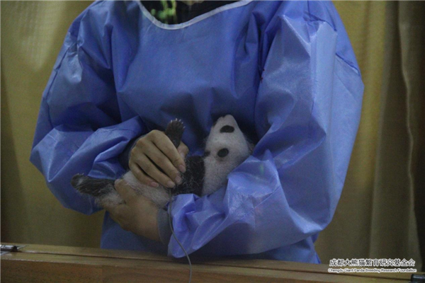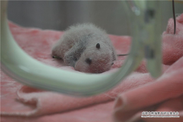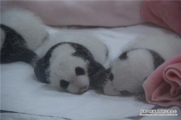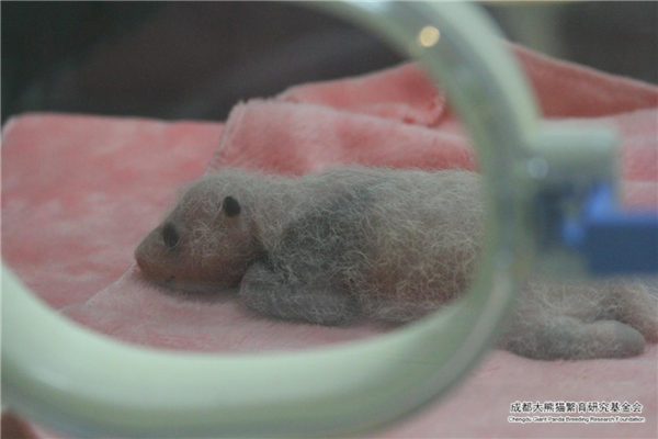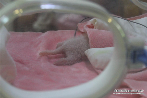 En cautiverio, poco después del nacimiento los cachorros de panda son colocados celosamente en una incubadora caliente y cómoda por los cuidadores. Al nacer, los bebés pandas son rosados y tiernos con un escaso pelaje blanco. En este momento, todavía no han tenido dientes y no pueden gatear. Después de una o dos semanas, los pelos oscuros comenzarán a oscurecerse. En aproximadamente un mes, los bebés han comenzado a tomar la apariencia de pandas gigantes adultos.