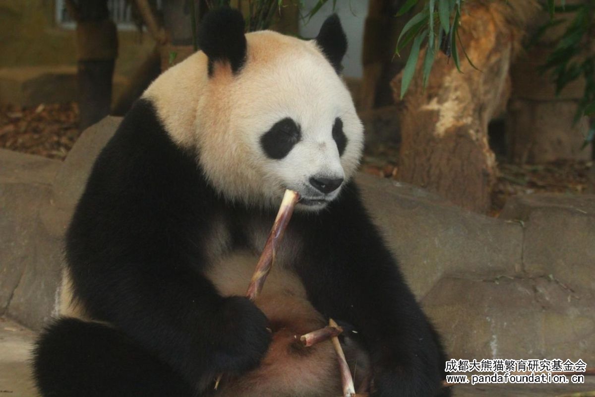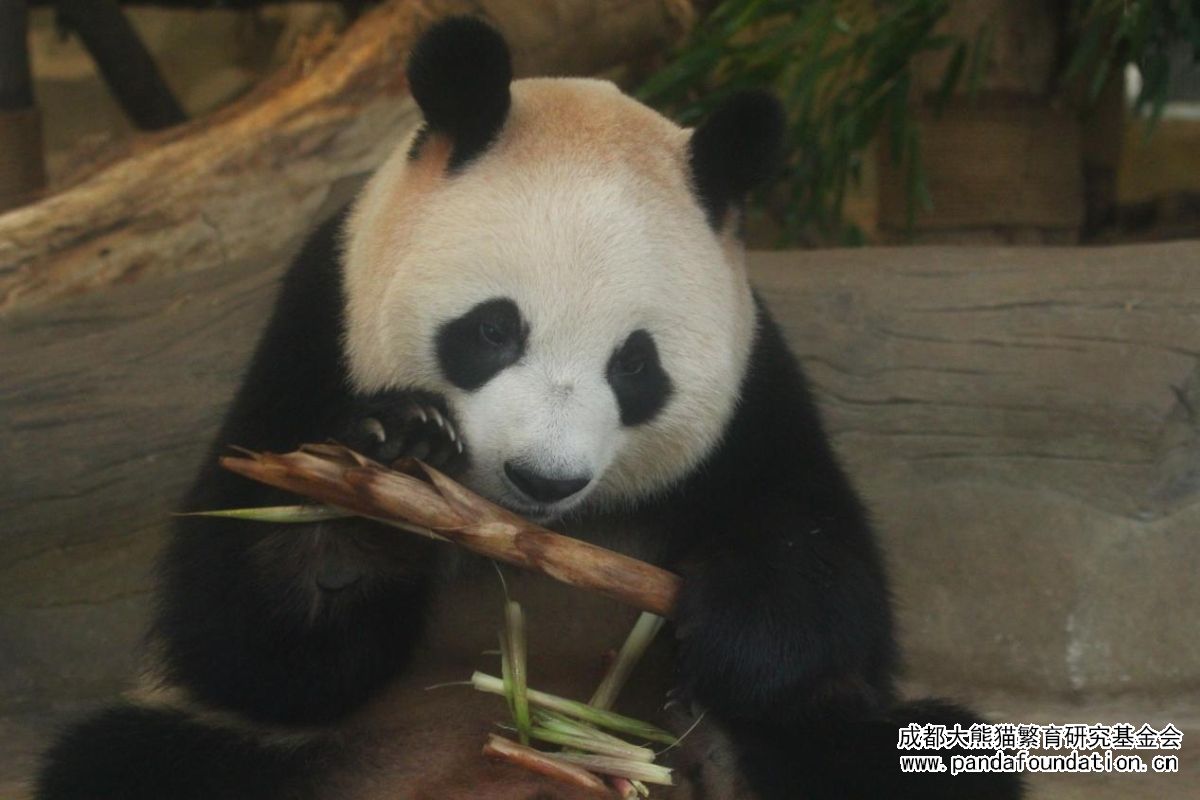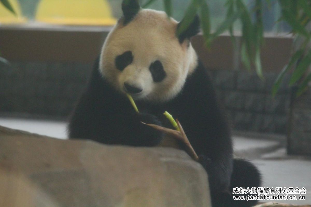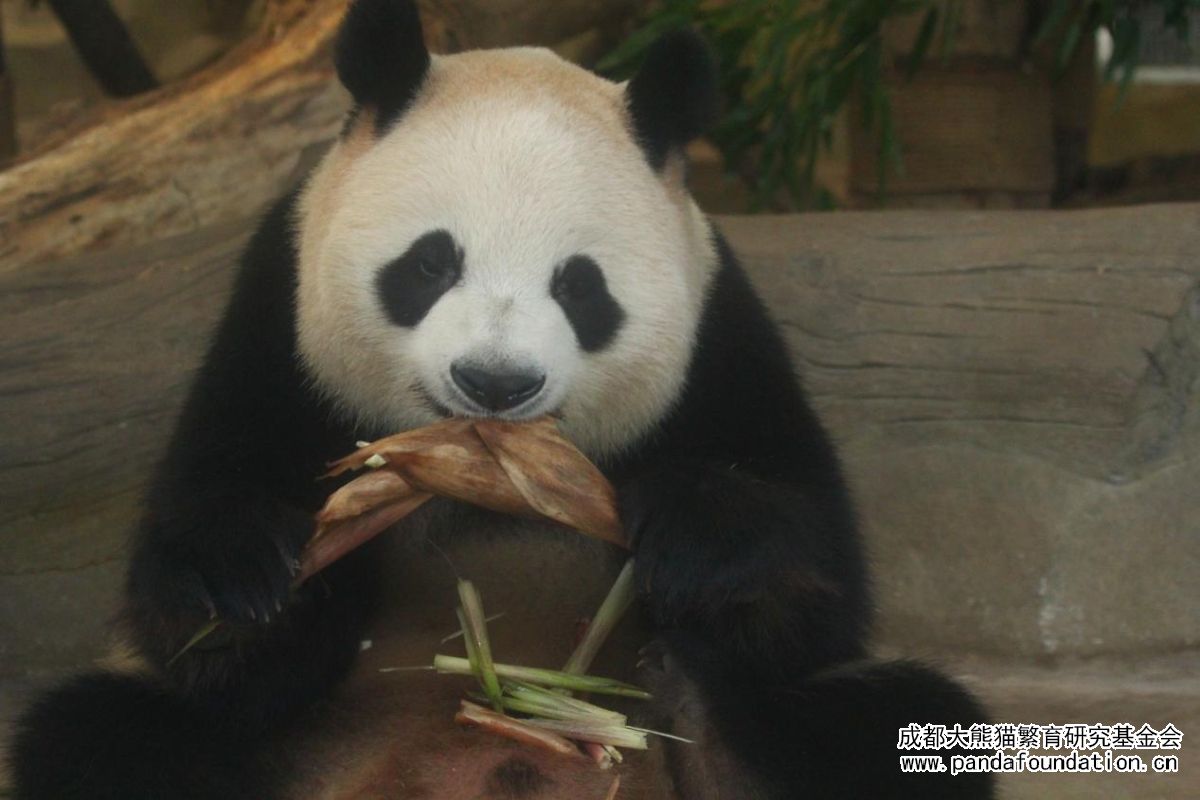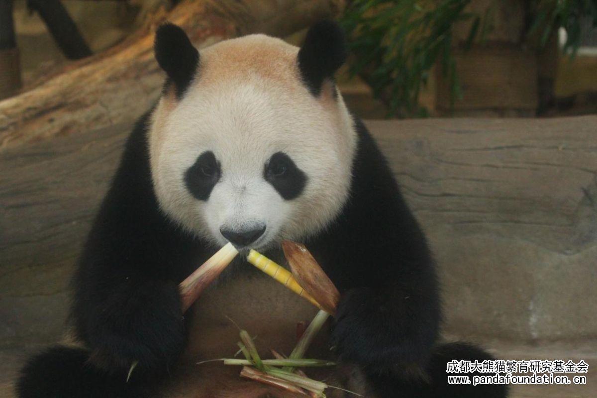 La adorable Run Yue comiendo brotes de bambú con dedicación