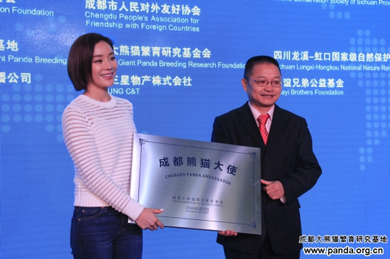 成都ジャイアントパンダ繁殖研究基地の張志和博士より「UNDPパンダ使者」の名誉プレートをいただいた名優の袁姗姗さん