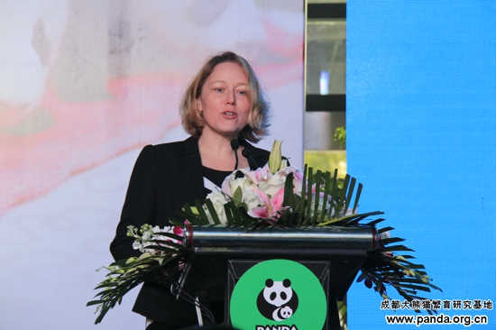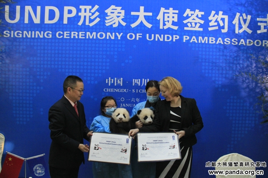 「UNDPイメージ大使」の署名式典に出席された国連開発計画署在中国代表処の文霭洁主任と成都ジャイアントパンダ繁殖研究基地の張志和博士