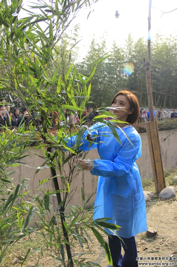 月産室でパンダに食物の準備をしておく「UNDPパンダ使者」の袁姗姗さん