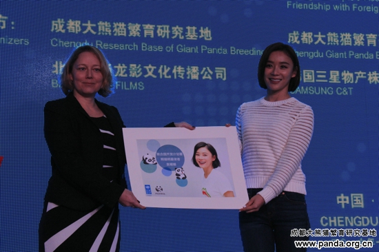 国連開発計画署在中国代表処の文霭洁主任(Agi Veres)より「UNDPパンダ使者」の証明書をいただいた女優の袁姗姗さん