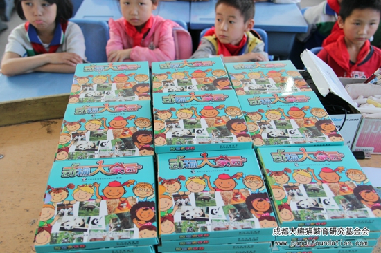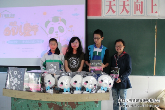 生徒にプレゼントコーナーで、「動物大家族」や「黒と白の魔法時空」や「パンダの秘密」など、パンダや動物たちについての科学普及書物を学校の生徒たちに贈りました。