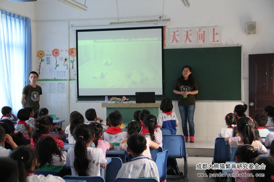 パンダや環境保護知識の解説コーナーは小学二年、三年、五年そして中学一年でおこなわれて、生徒たちの学年によって、学年別の解説内容を用意しました。教員たちは生徒たちとのやり取りや面白さを重視し、画像とビデオとモデル及び質問を組み合わせで解説をおこなわれて、生徒たちに楽しみなからパンダや環境保護の知識を会得させます。
