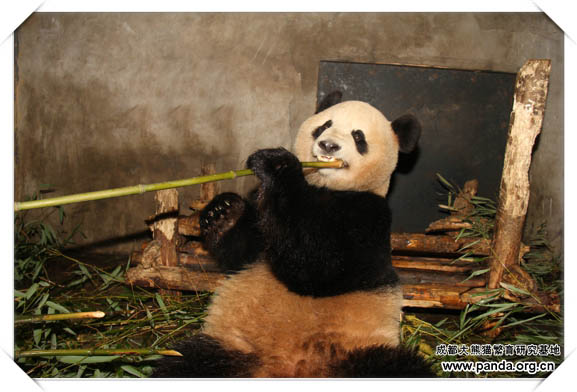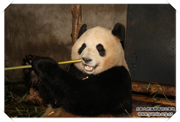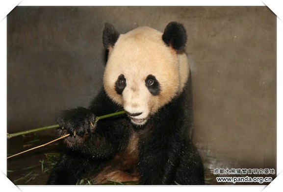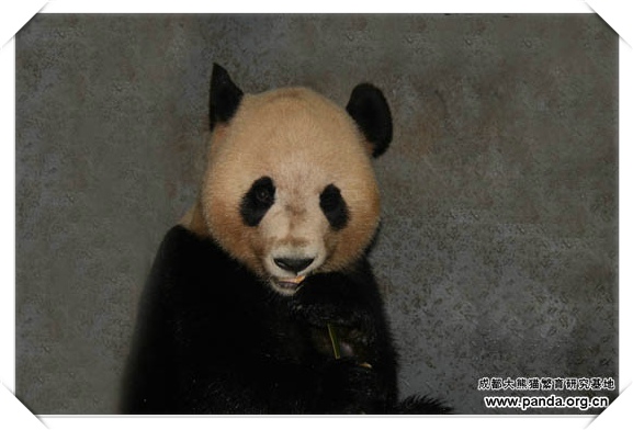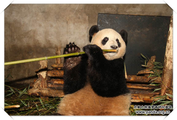 日本へ旅したパンダ「永浜」が笹を食べています