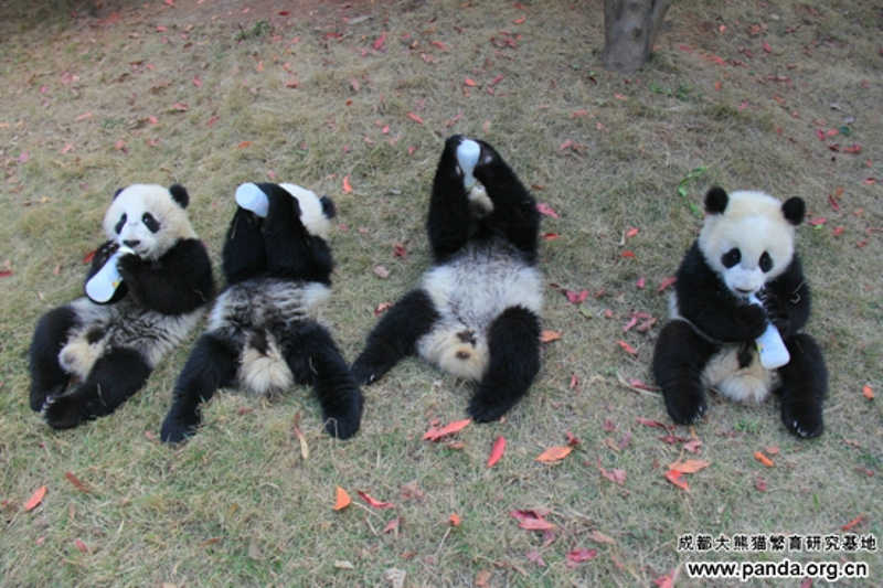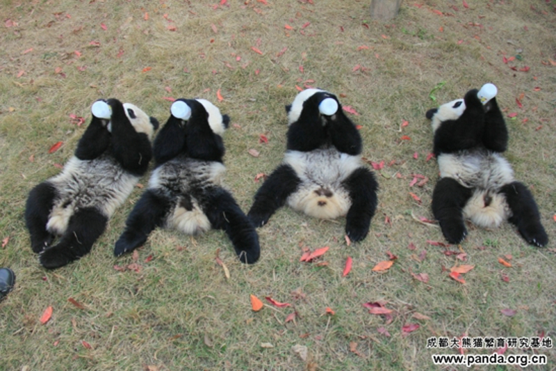 朝のパンダ幼稚園で、赤ちゃんパンダが朝ごはんを食べるシーンを見た。まずみんなは一行に座る。
