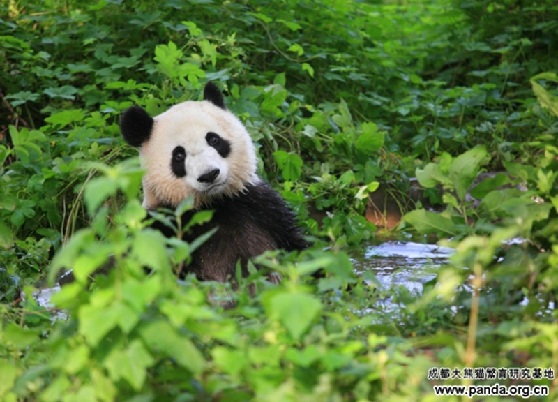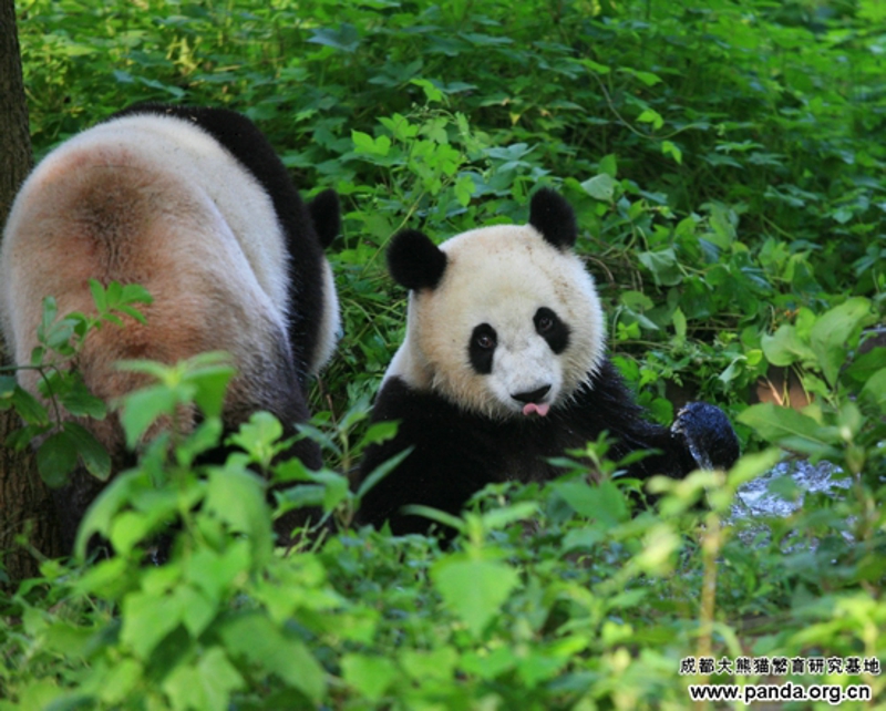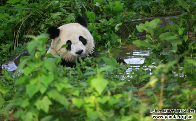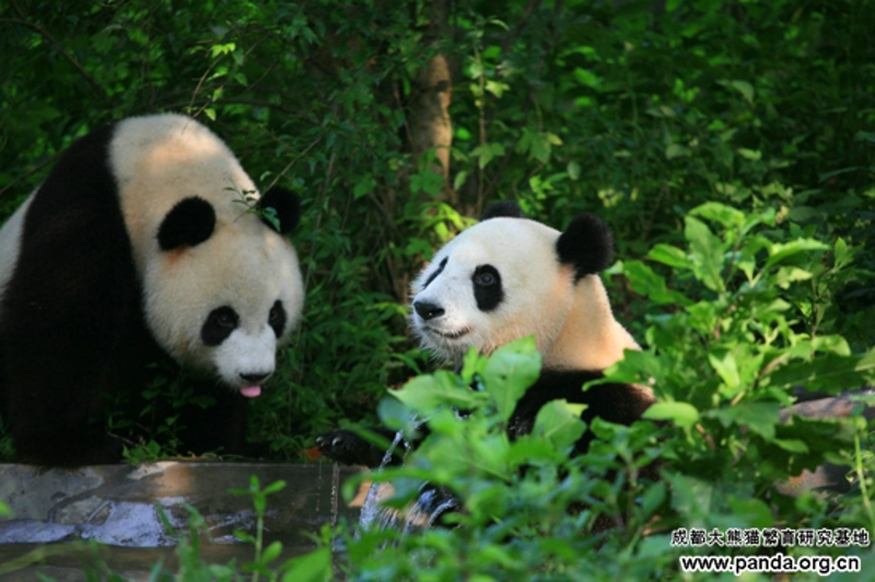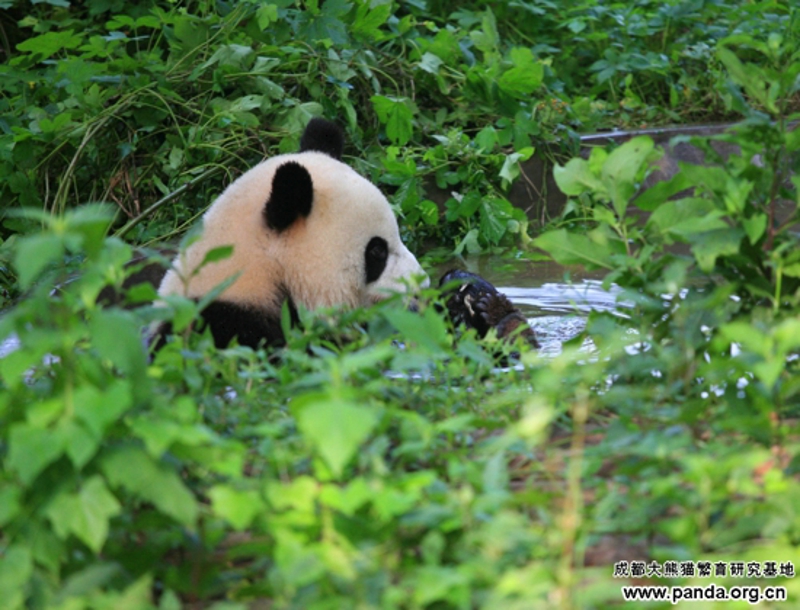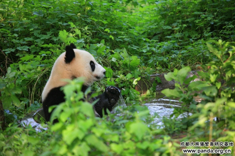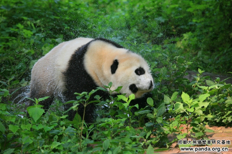 また夏に入りました。周知のように、暑さに弱いパンダにとって、夏はしんどい時期です。野生パンダが海抜の高いところに引っ越すのに対して、人工飼育のパンダにも避暑が必要です。暑気当たりを予防するために、気温が25度以上に上がると、パンダたちはエアコンの付いている室内へ移されます。そのほか、ガーデンにある露天風呂場で風呂に入るのも気持ちいい夏の過ごし方の一つです。