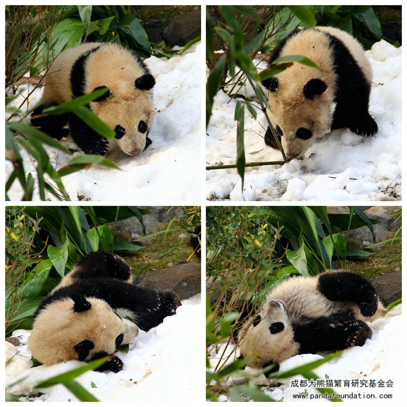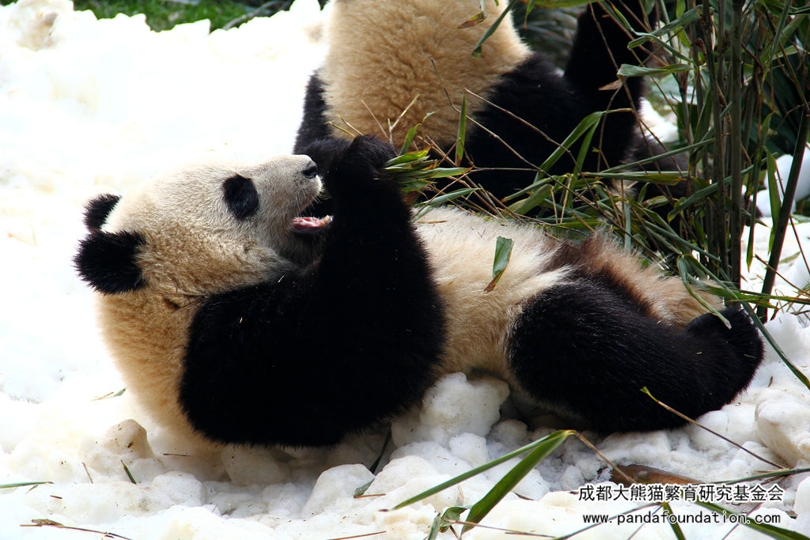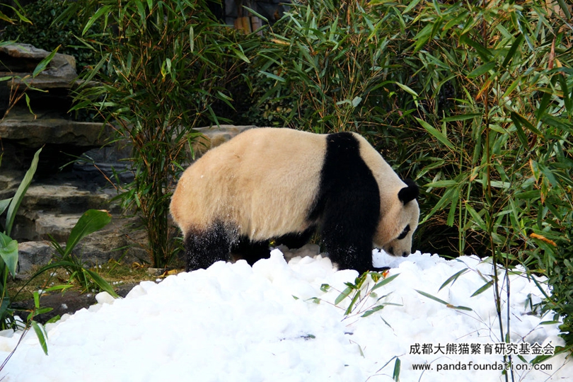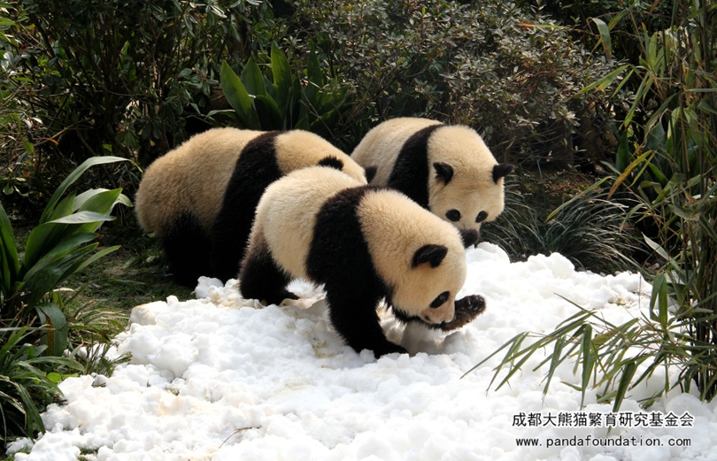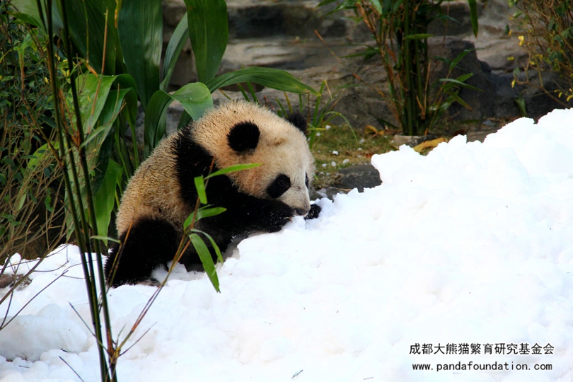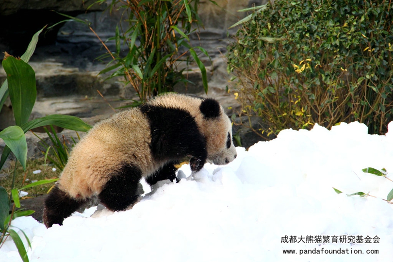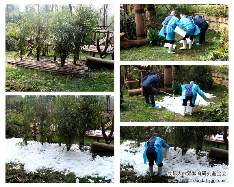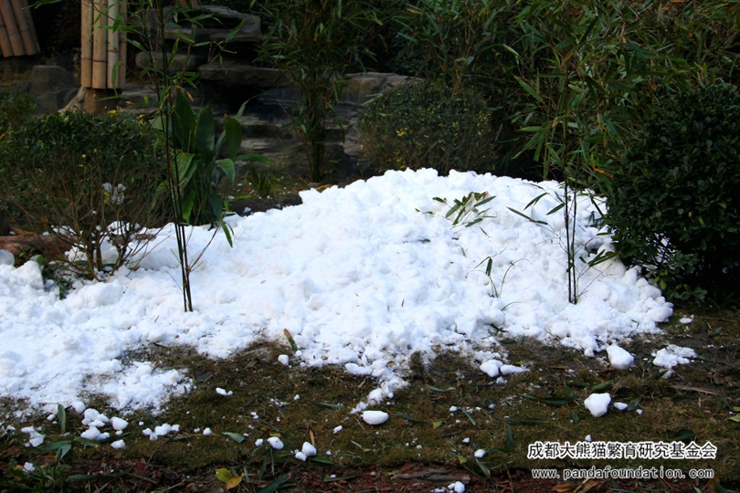 元々野生のパンだは海抜が高い山間地帯に暮らし、気温低い環境に耐える動物だと見られます。しかし、成都は中国の西南地方なので、あまり雪が降りません。だから、飼育員はパンダが雪が見えるように人工雪を用意しました。