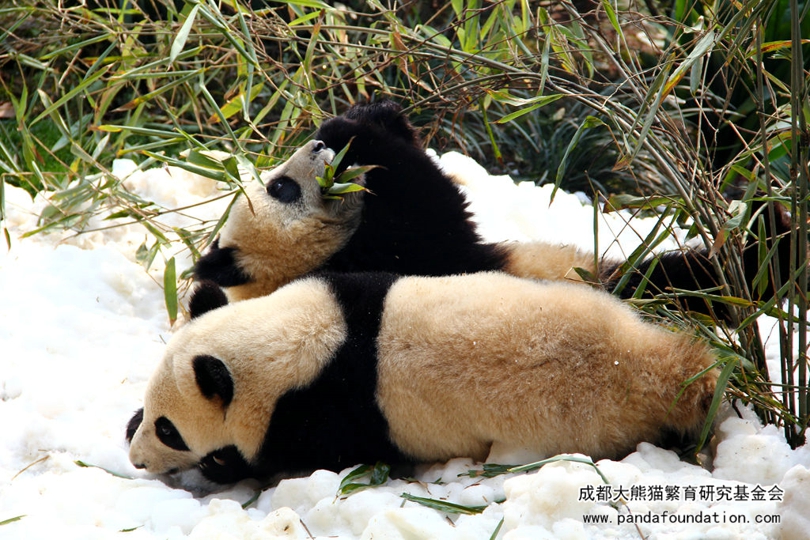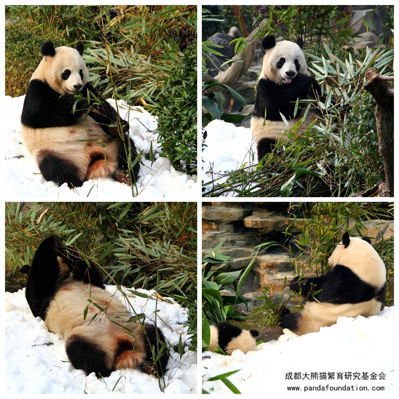 その後、二二は「晶亮」(ジンリャン)を連れてここに来ました。「ニナ」より「二二」と「晶亮」がもっと活発で、雪の中に転んだり、互いに騒ぎ回ったり、雪の玉を舐めたりしています。たいへん疲れたから、「二二」は雪の上に座って竹を食べ始めました。