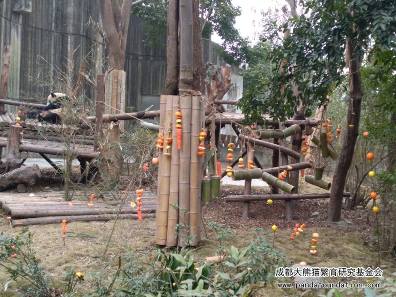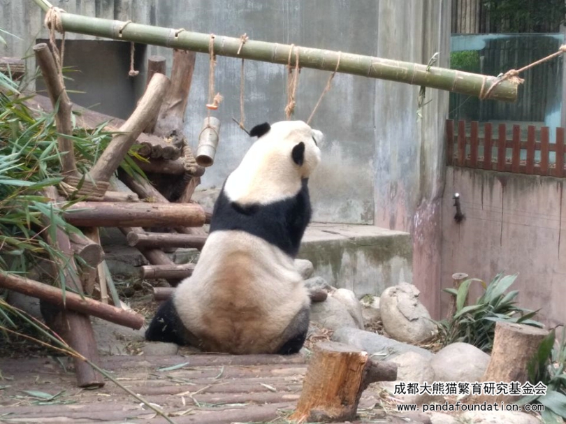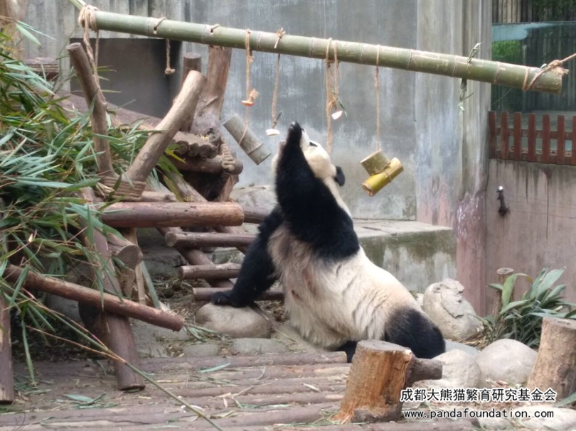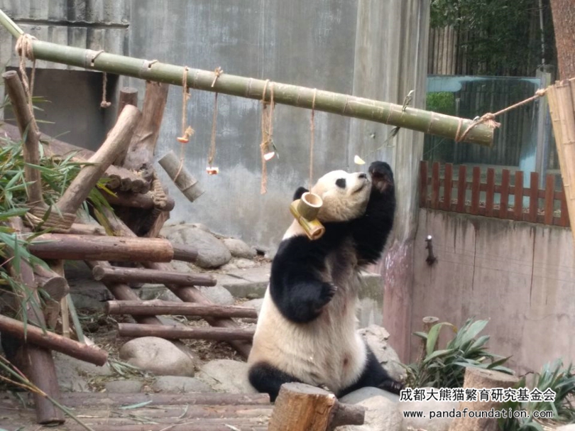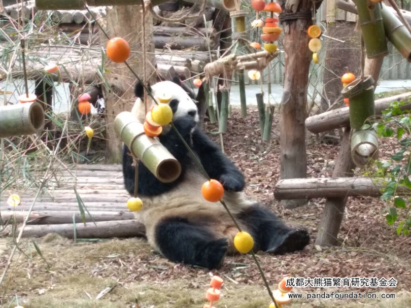 以上のフルーツパーティーは、実はジャイアントパンダを鍛えるチャンスです。一方では、「萌萌」が立って吊り上げたリンゴを食べることで、後ろ足を鍛えることができます。一方では、匂いの違った果物を使うのは、パンダの嗅覚を鍛えるためです。