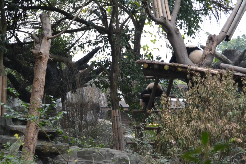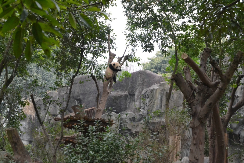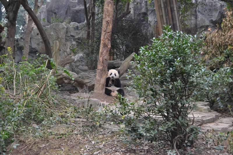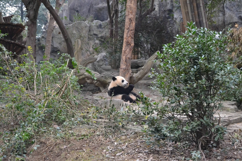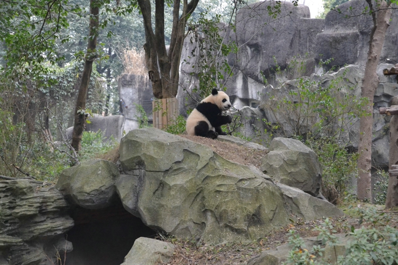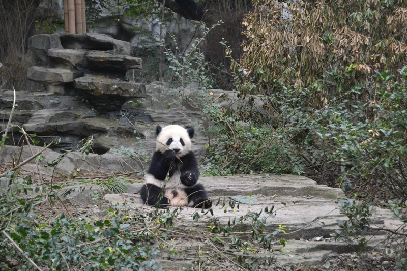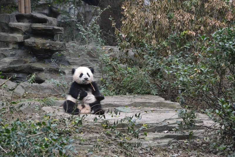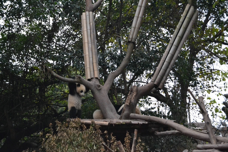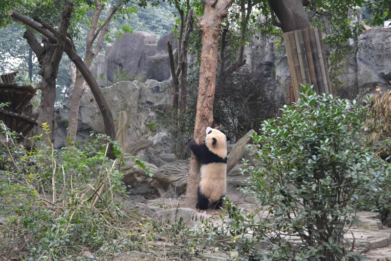さっきの角度はパンダを見るのにちょっと遠すぎです。それで、「蛋烘糕」は舞台の前に来て、枯れ枝を遊ぶことを展示します。