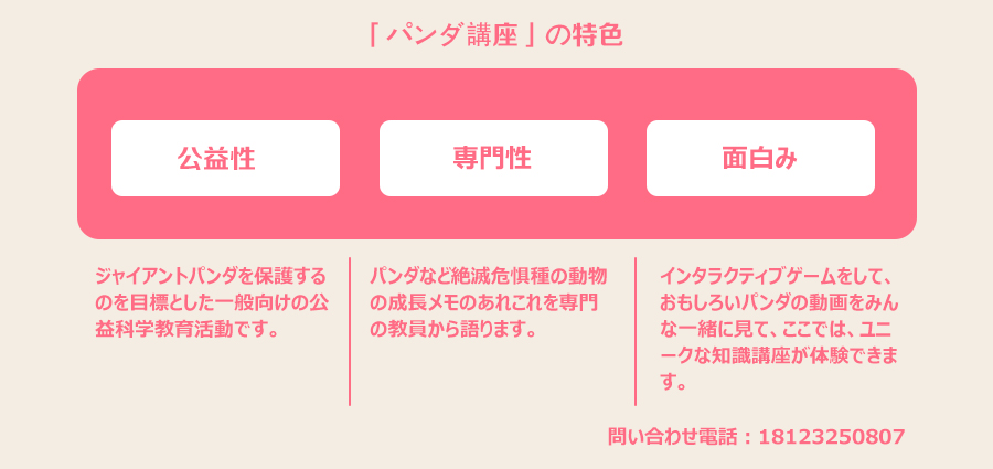 「パンダ講座」は成都ジャイアントパンダ繁殖研究基金会が設立した一般向けの科学教育活動として行われています。絶滅危惧類の動物に対する関心を喚起して、みんなの保護意識を強化するため、「パンダ講座」は青少年を主な対象として長期的に形式が多様で内容が豊富な公益科学教育活動を行って、ジャイアントパンダなど絶滅危惧類の動物の保護知識を宣伝します。